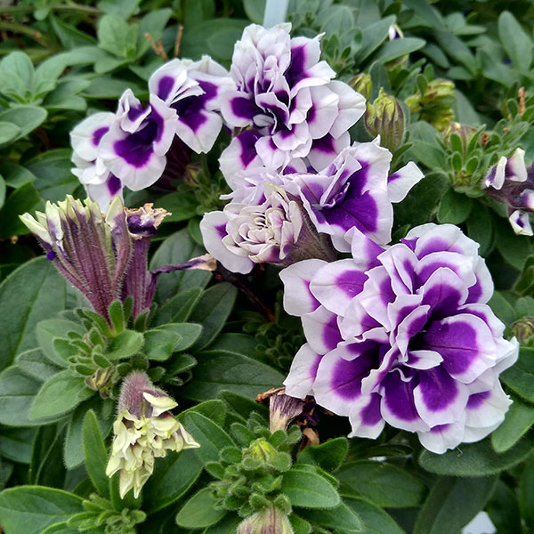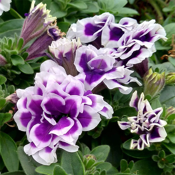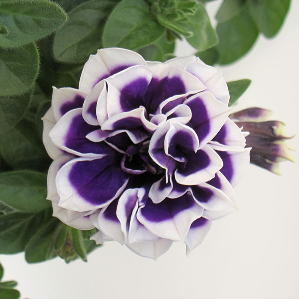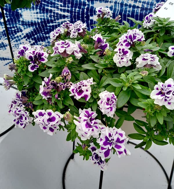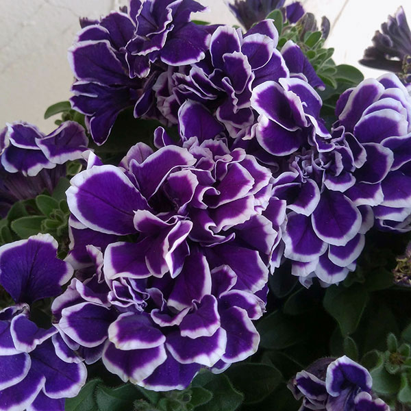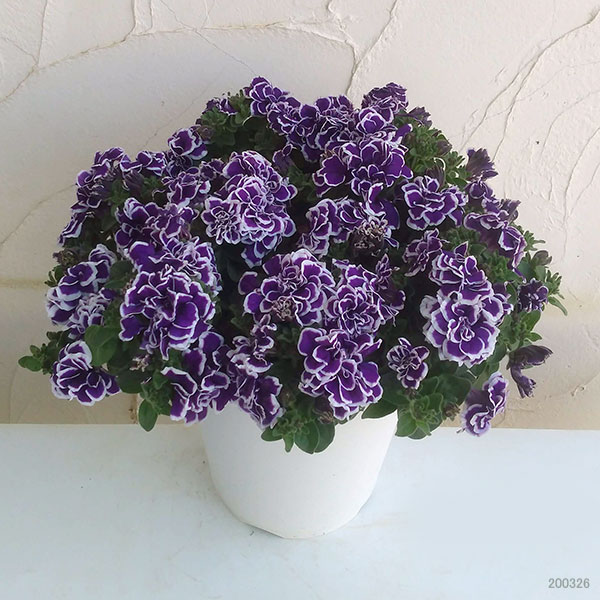 藍染(あいぞめ)は日本生まれの八重咲きペチュニア。日本の伝統色・藍色の白覆輪タイプの八重咲き品種です。