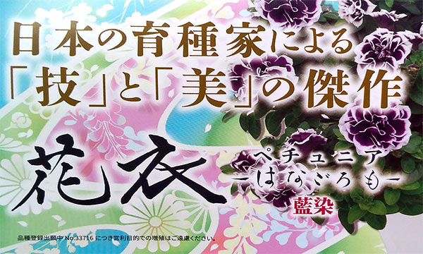 花衣(はなごろも)シリーズは、「桜が着物に舞い落ちる様子」「着物の衿の重ね」「豪華な着物」をイメージしたペチュニアです。桜の季節が終わる頃に咲き出し、三十枚以上もある八重咲きの花弁が着物の重ねを連想させます。日本人の心の琴線に触れるシックな色合い。長い歳月をかけて育種を繰り返し誕生しました。日本の種苗会社だからこそ生まれた品種と言えます。