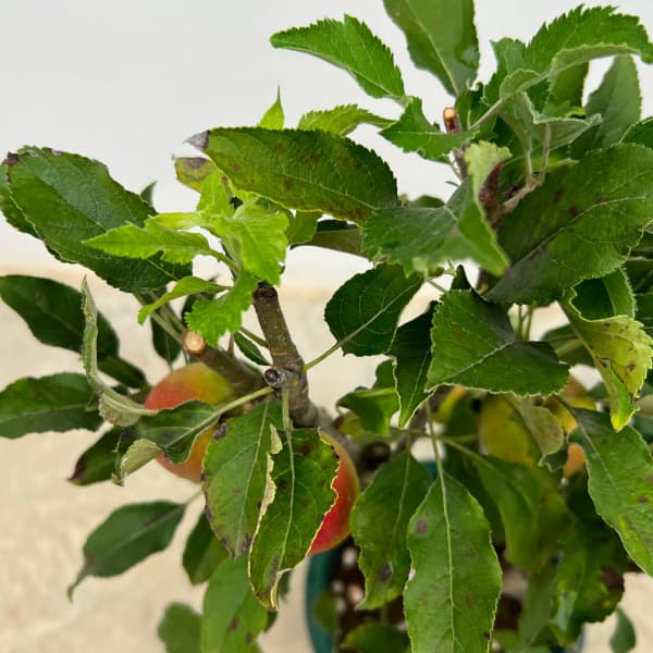 りんごは病虫害に弱いので、栽培ガイドなどの薬剤散布暦に従って防除してください。病気はウドンコ病、落葉病に注意。害虫はアブラムシやハマキムシが発生することがありますので、薬剤等で防除してください。病気は雨にあたった後に発生しやすいので、鉢植えで育てる場合は雨にあてないようにすると防ぐことができます。