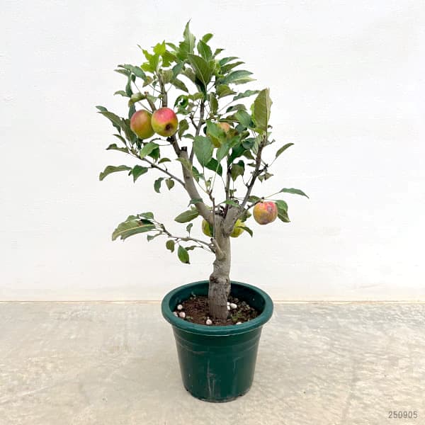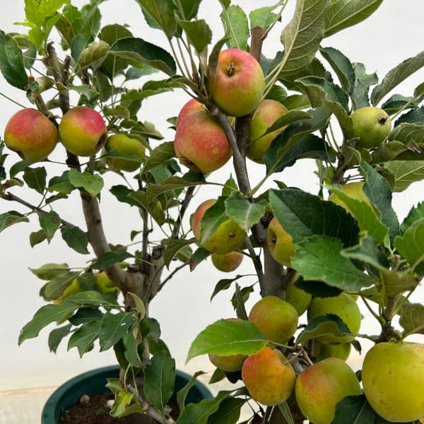 人気のリンゴの大株仕立てです。ミニリンゴでは一番人気のアルプス乙女。長円形の実は1個25~30gと小型ですが、糖度が15度とさわやかな甘味でおいしい品種です。豊産性で、真赤な実が鈴なりになったところは観賞価値も高く、食用としてだけでなく、庭木や鉢植えにもおすすめ。アルプス乙女は自家結実性がありますので、1本で結実します。異品種を組み合わせるとより豊産となります。