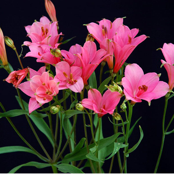 植え付け前に0.5平方メートル当たりパーライトや腐葉土等を10リットル、緩効性の化成肥料(マグアンプK)等を一握り施し混ぜ合わせ、土作りをします。アルストロメリアの栽培で最も注意することは過湿による根腐れで、6~8月頃に被害を受けます。大雨の後、雨水が長時間停滞する所は盛土などをして改善を図ります。日照は半日陰程度得られる場所とします。2~3年たって株が増えた場合や、冬に地上部の枯れない無霜地帯では、茎葉がこんで、蒸れやすくなるので細かい茎や土際から葉が密についている茎は間引きをして、通風、日当たりを良くします。鉢植えの場合は18cm以上の深鉢に植えます。鉢の表面が乾いたら水をあげてください。肥料はハイポネックスの1000倍液を月2回与えてください。ポットやプランターで栽培する場合も茎葉が霜枯れする頃、鉢ごと地中に埋め込みます。