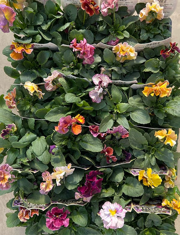 豪華なフリル咲きの花弁で、花色はシックであでやかな絞り咲きやワインレッド色のストライプ模様が入るものや、ディープ~テンダーな色合いまで、シンプルだったり複雑な色合いであったりと、ユニークで幅広い色合いが魅力なパンジーです。