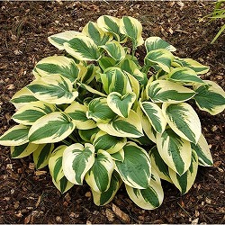 斑入り葉やライムグリーン、ブルー系など葉のバラエティが豊富で、また葉や株のサイズも大小さまざまなので、鉢植え、庭植えなどいろいろな場所で利用できます。いくつかを組み合わせて植えたり、1株で大きな鉢に植え込むのも素敵です。初夏に薄紫色~白の花を咲かせます。秋に地上部が枯れますが、冬越しさせると根元から子株が出て、翌年はよりこんもりした姿に育ちます。